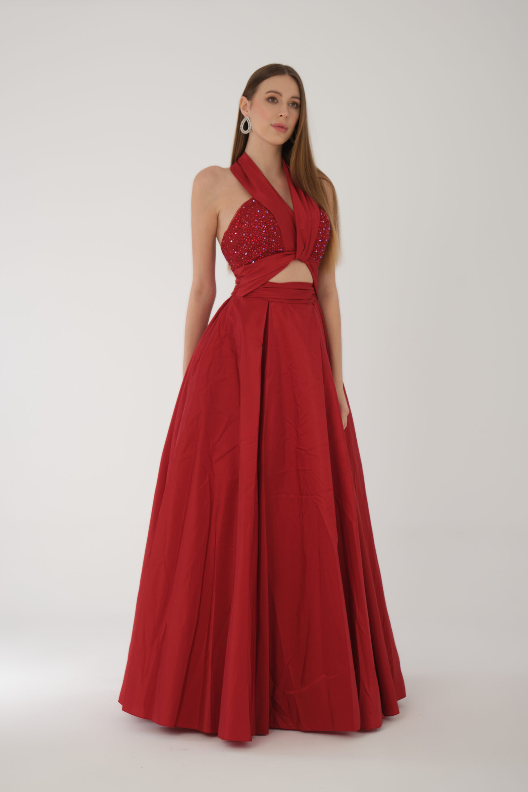 - This dress features a halter neckline with a hand-embellished bodice, a stylish cut-out design at the waist, and a full-length pleated skirt for an elegant flow.